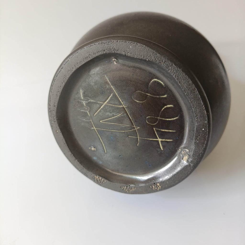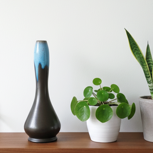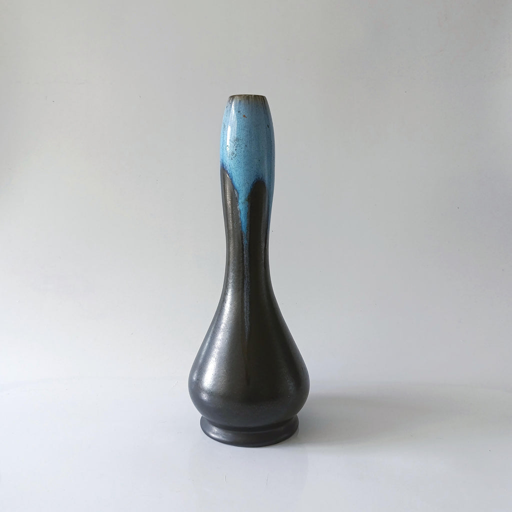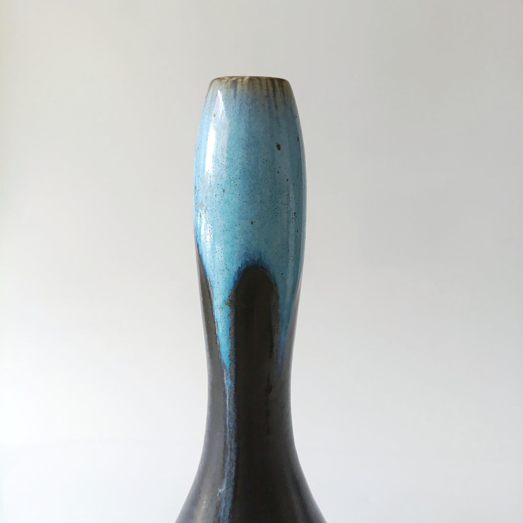 אגרטל בקבוק מקרמיהוינטג' אירופאיצבעוניות מקסימה של שחור ודוגמת לבה בכחול בהיר בחלק העליוןםיה צרה, יתאים מאוד ליחורים או לפרח בודד או שנייםללא סדקים או צ'יפיםגובה 31 ס"מ