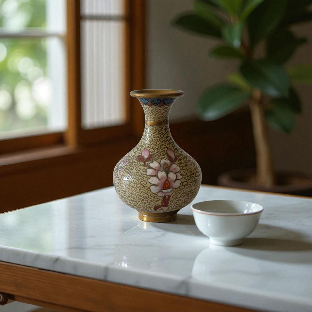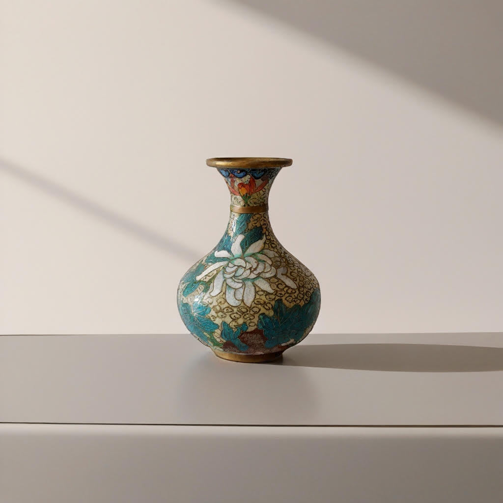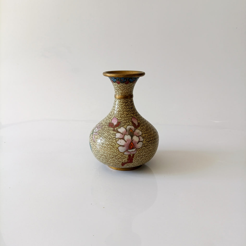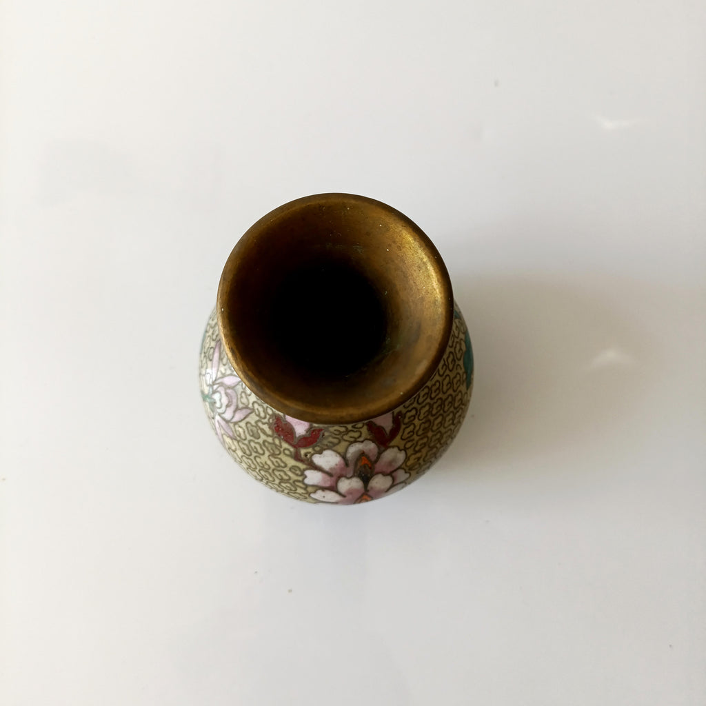 אגרטל מסוג קלוזונה - Cloisonneוינטג' סיניעשוי בראס מעוטר בצבעי אמייל, עבודת ידמצב וינטג' טוב מאוד, ללא פציעותגובה כ-13 ס"מ