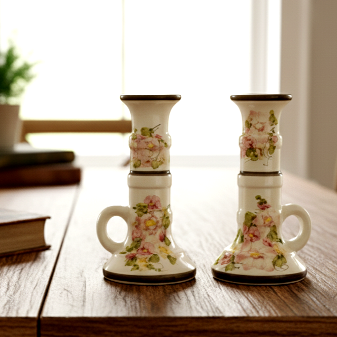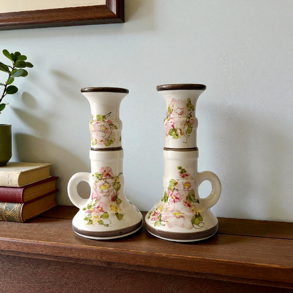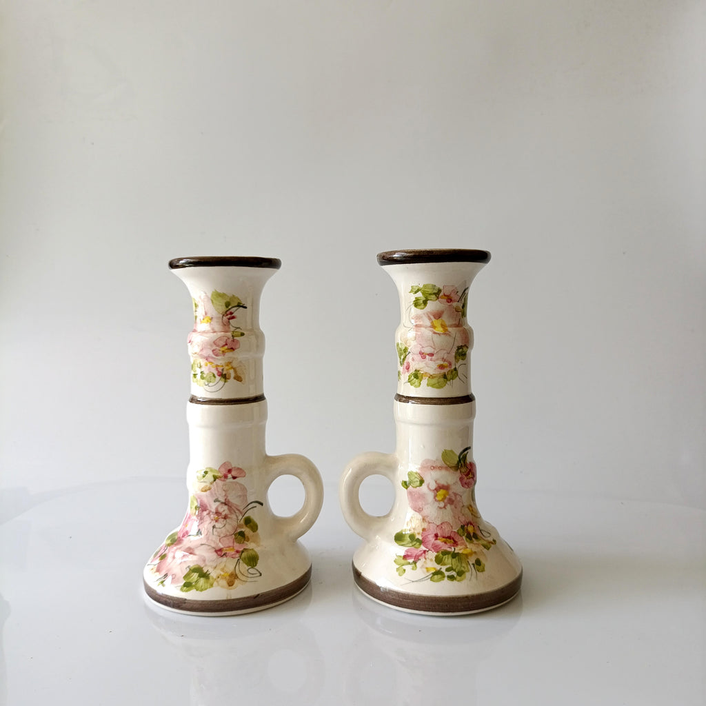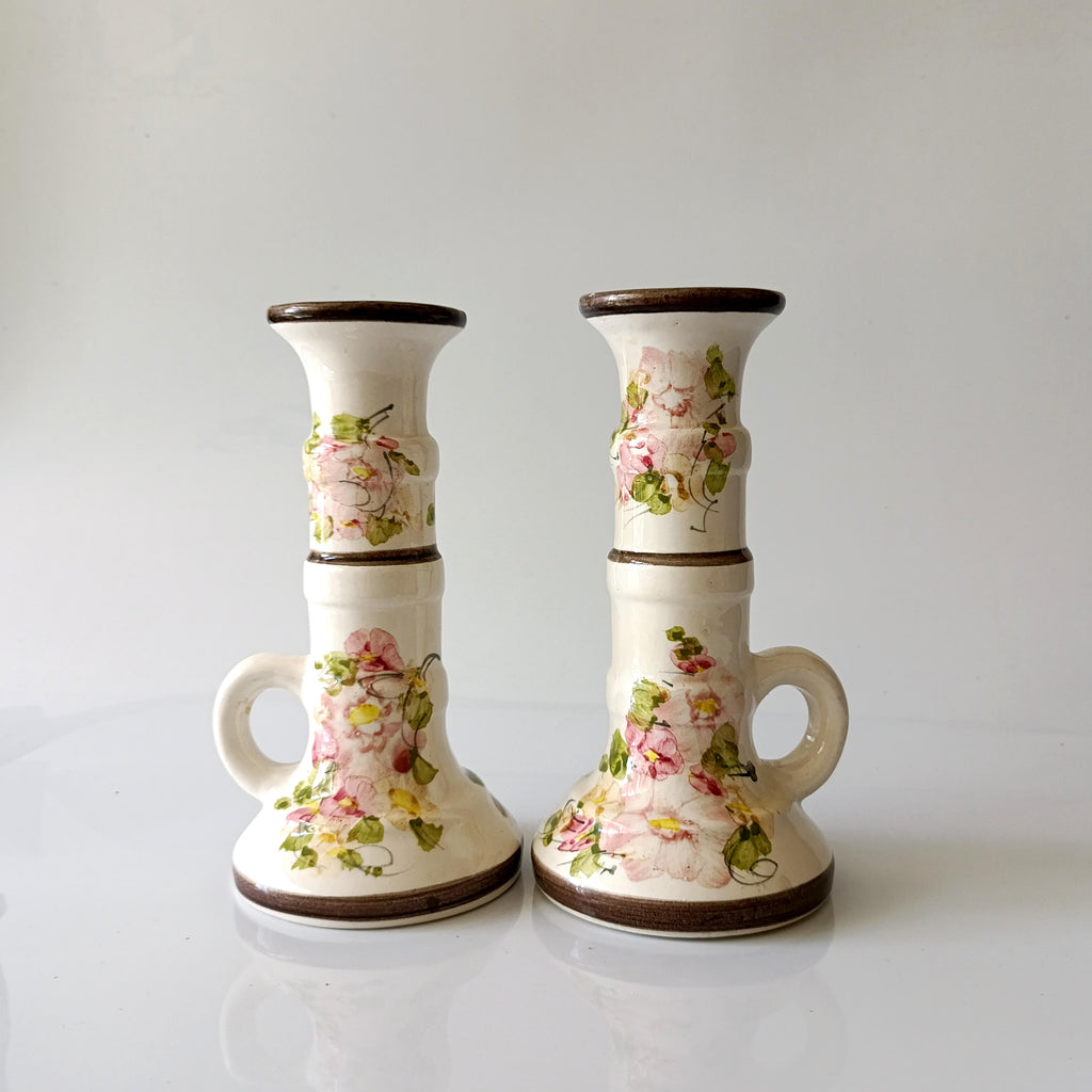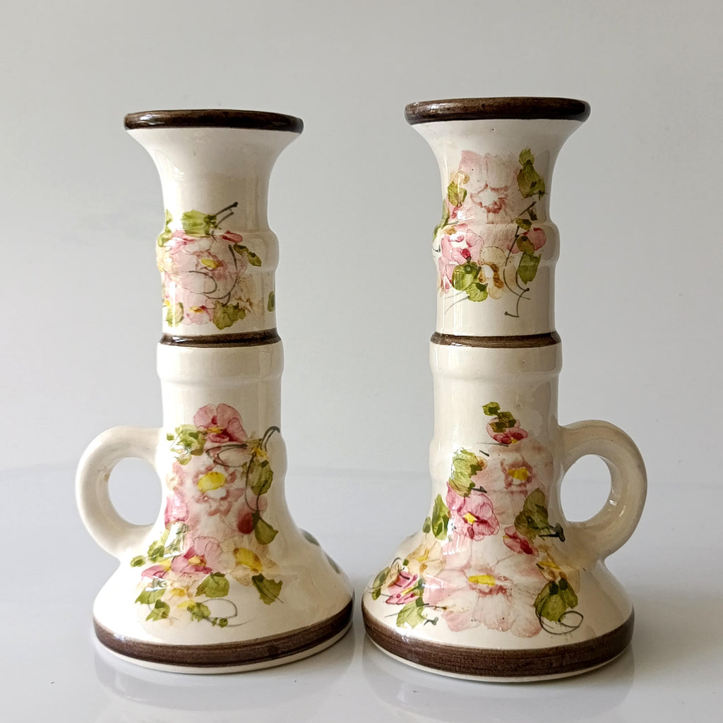 זוג פמוטי קרמיקה וינטג' ישראלי של חווה שלזינגר מעוטרים מכל צידיהם בפרחים בצבעוניות רכה, ציור יד מהיפים בז'אנר! מצב וינטג' טוב מאוד, ללא סדקים או צ'יפים מידות: קוטר בסיס 9.5 ס"מ, גובה 19.5 ס"מ
