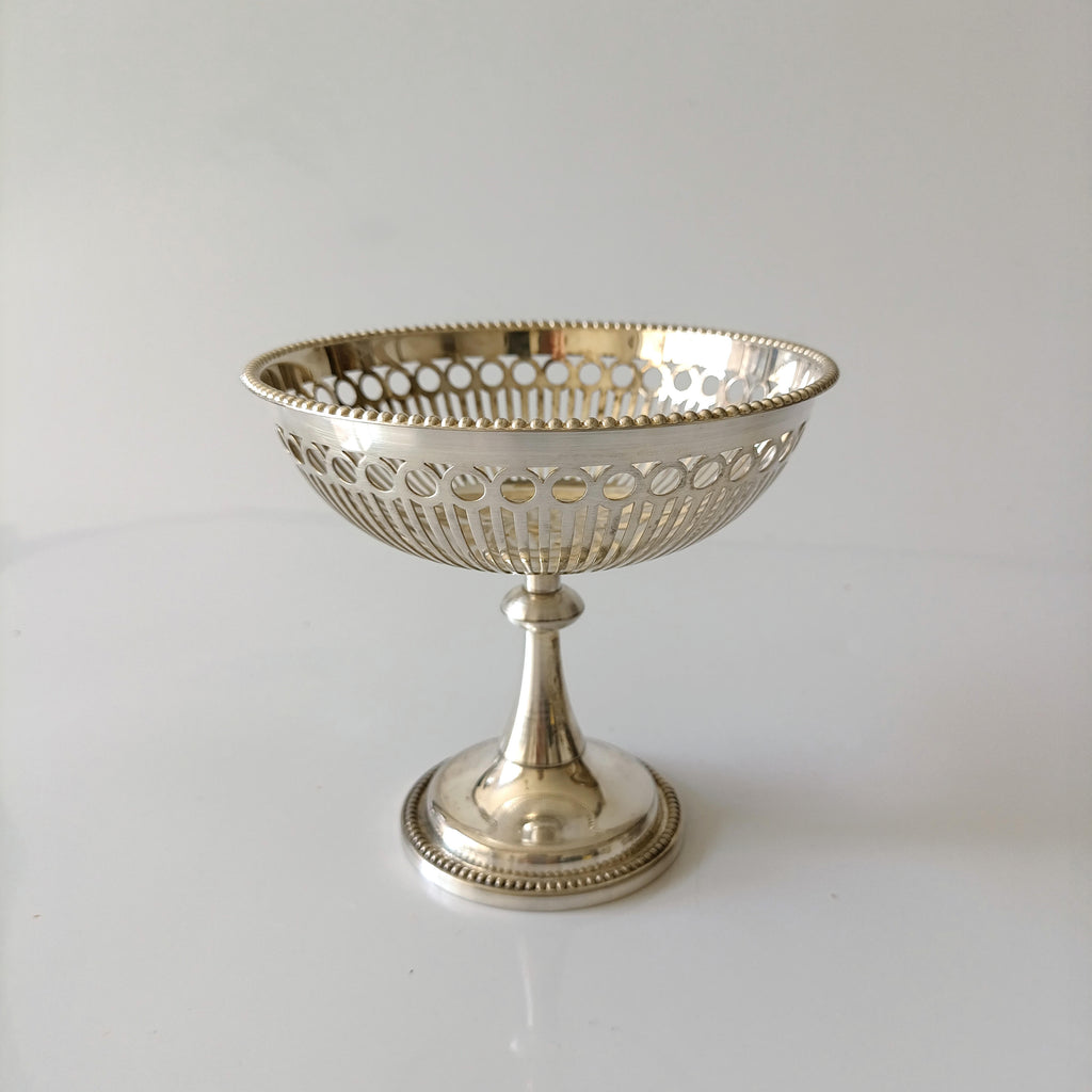 כלי על רגל, וינטג'Silver Platedנהדר לסוכריות או לתכשיטיםמצב וינטג' טוב מאוד, מעט סימני זמן ופטינהמידות: גובה 10.5 ס"מ, קוטר 11.5 ס"מ
