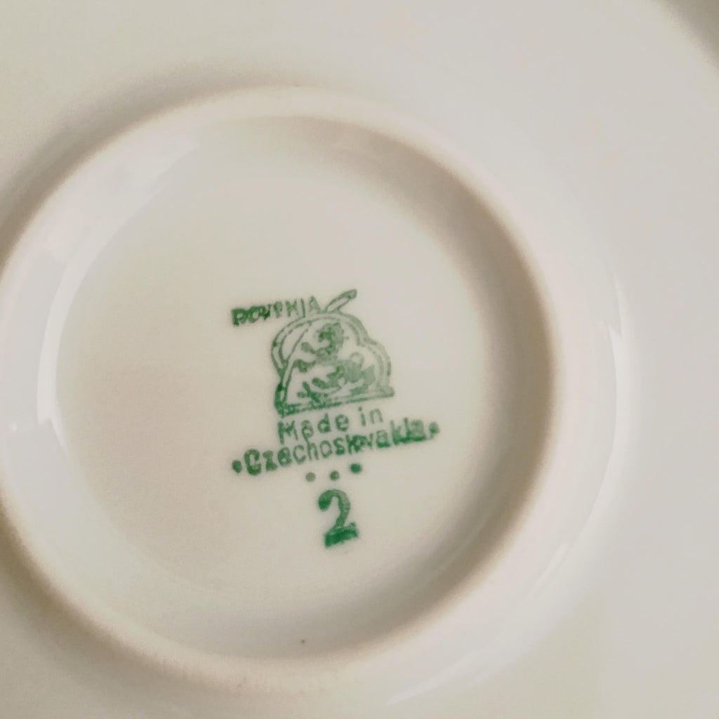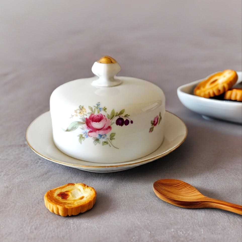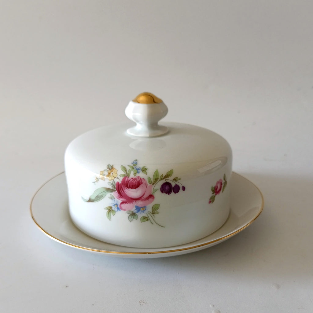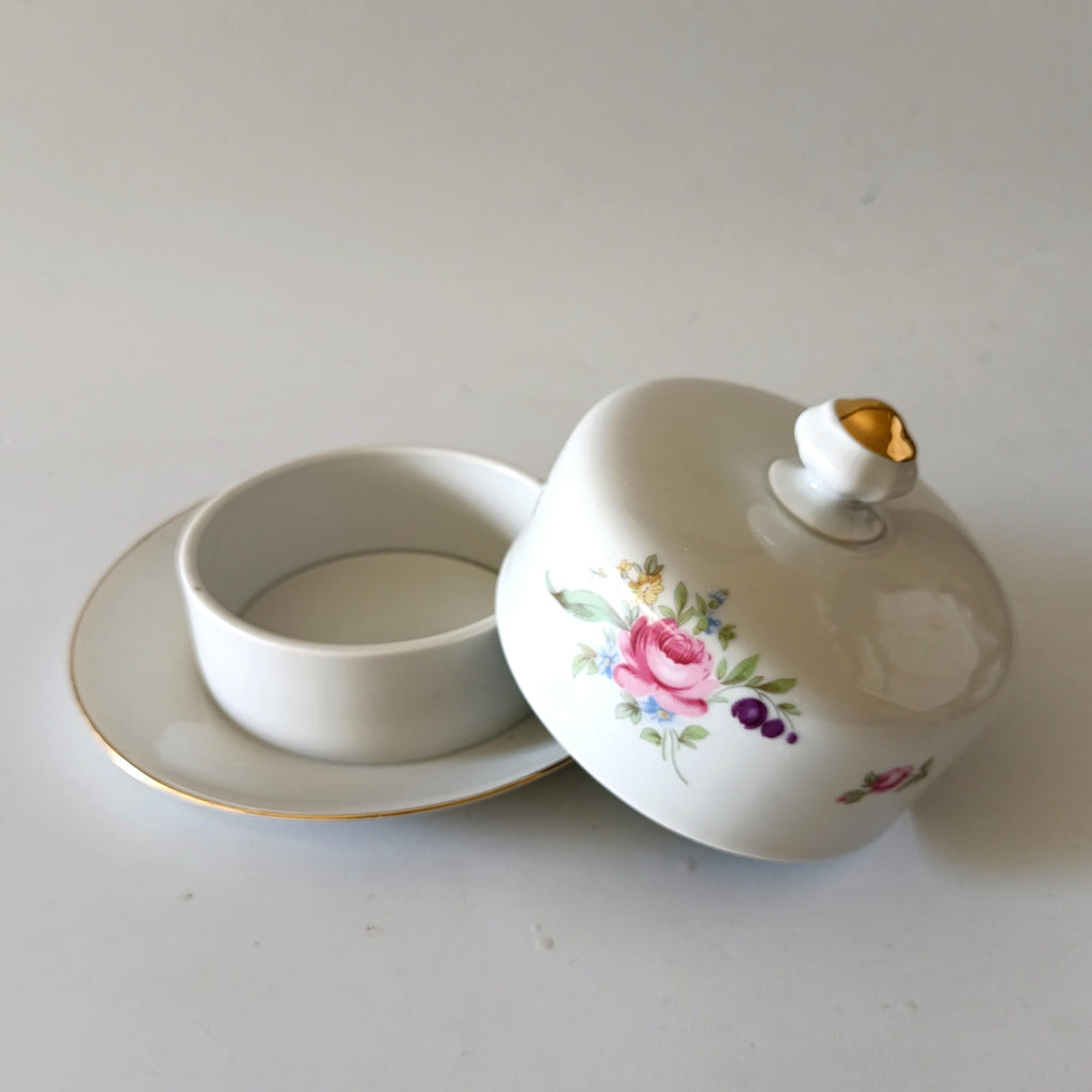 כלי פורצלן לחמאה או ריבהוינטג' צ'כימעוטר בפרחים בסגנון אירופה הקלאסית ונגיעות זהבללא סדקים או צ'יפיםקוטר בסיס (צלחת תחתונה) כ- 16 ס"מ