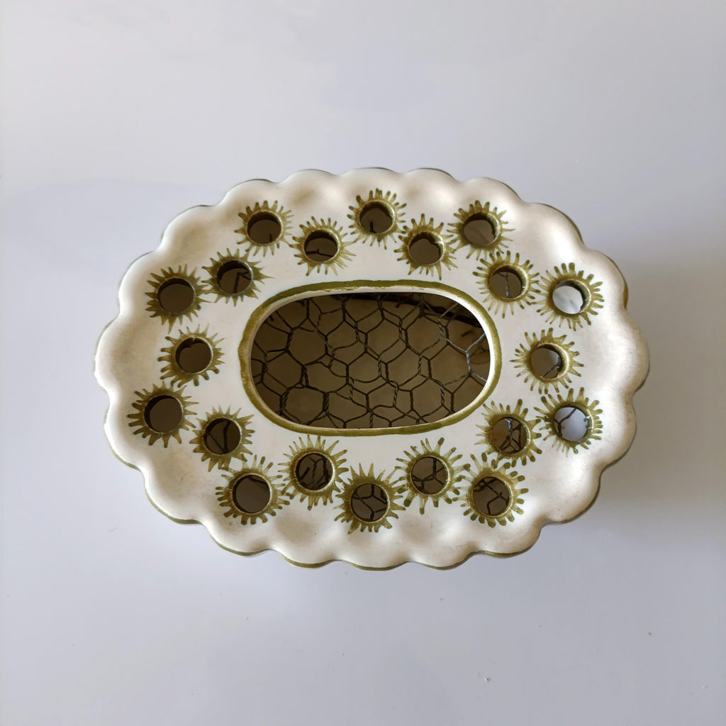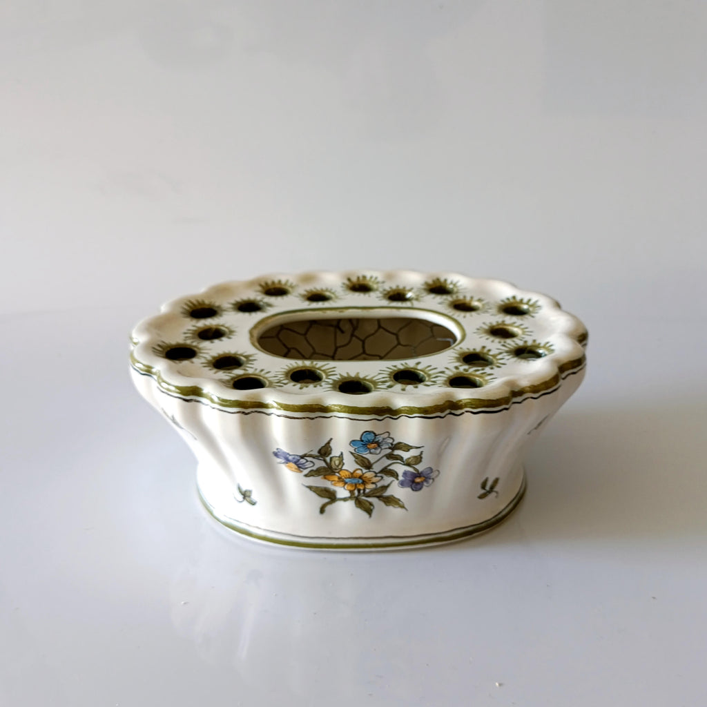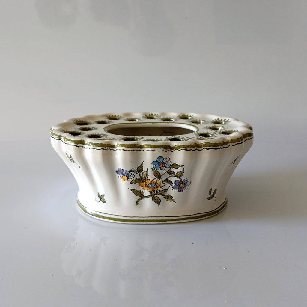 כלי קרמיקה מתוק לסידור פרחיםוינטג' צרפתי, ציור ידלכלי חורים בחלק העליון לנעיצת פרחים, בנוסף יש בתוכו רשת ברזל שמאפשרת נעיצת פרחים גם במרכז הכלי מצב וינטג' טוב מאוד, ללא סדקים או צ'יפיםמידות: 17.5X13 ס"מ, גובה כ-7 ס"מ