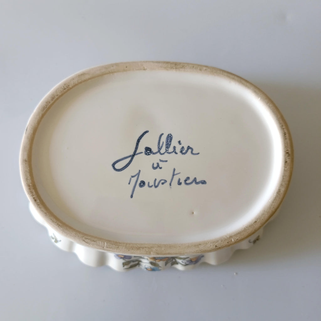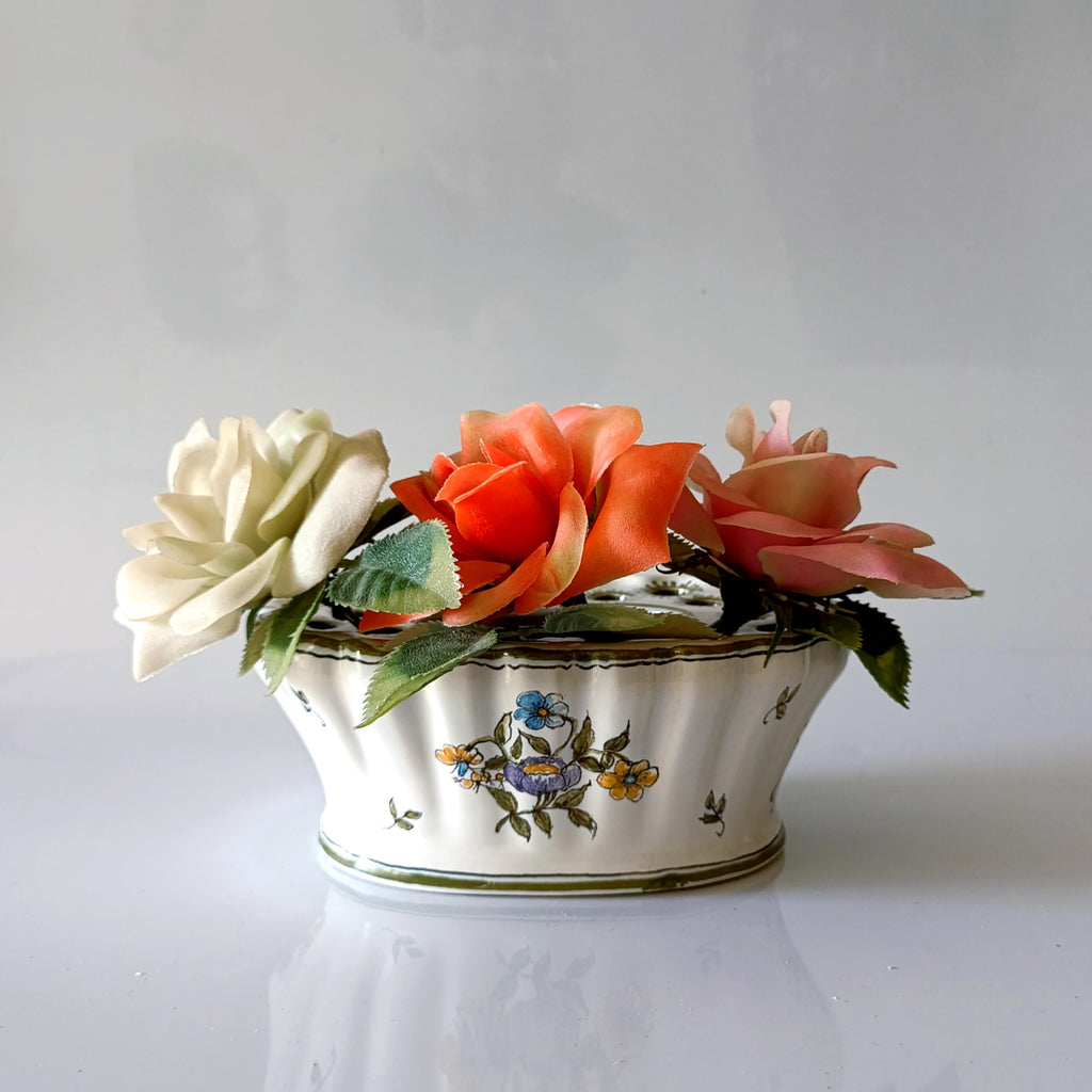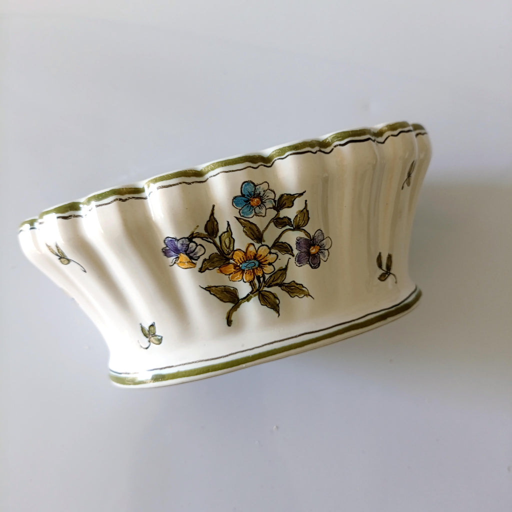 כלי קרמיקה מתוק לסידור פרחיםוינטג' צרפתי, ציור ידלכלי חורים בחלק העליון לנעיצת פרחים, בנוסף יש בתוכו רשת ברזל שמאפשרת נעיצת פרחים גם במרכז הכלי מצב וינטג' טוב מאוד, ללא סדקים או צ'יפיםמידות: 17.5X13 ס"מ, גובה כ-7 ס"מ