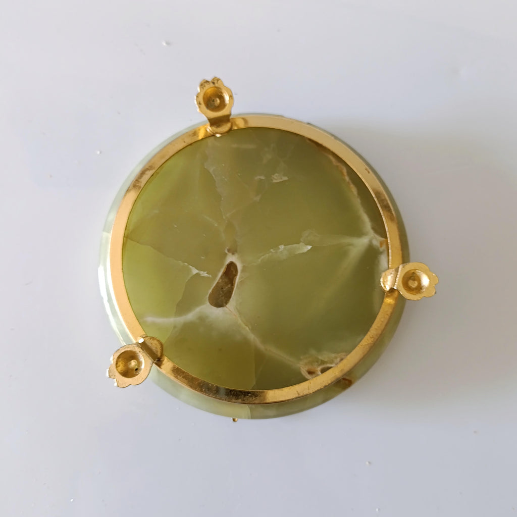 עשויה מצלוחית אוניקס ועיטורי בראס, עומדת על 3 רגללים בצורת כפות רגליים של אריה.