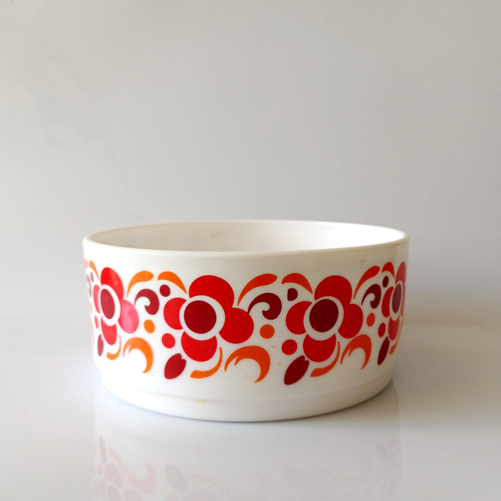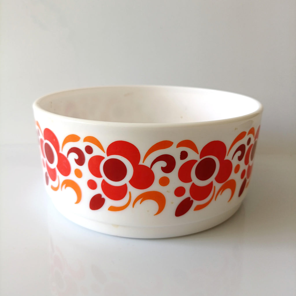 קערת הגשהוינטג' צרפתי של ארקופלמזכוכית חלבית, בדוגמא וצבעוניות שנות השבעיםמצב וינטג' טוב מאוד, ללא סדקים או צ'יפיםמידות: קוטר 21.5 ס"מ, גובה כ- 10 ס"מ