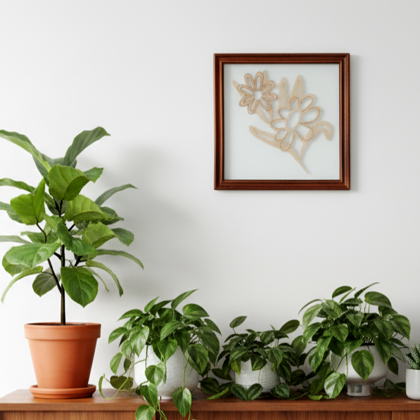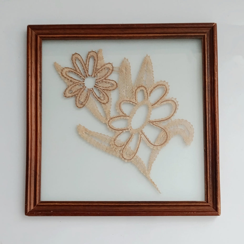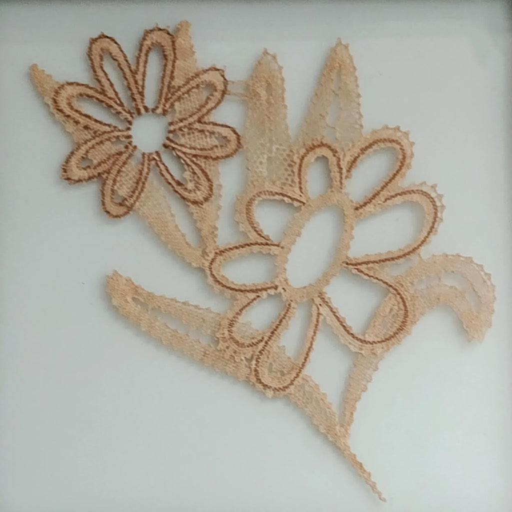 כאן תחרת סלילים בדוגמת פרחים שמוסגרה במסגרת זכוכית כפולה, דהיינו הן הגב והן החלק הקדמי של המסגרת הם מזכוכית שקופה.