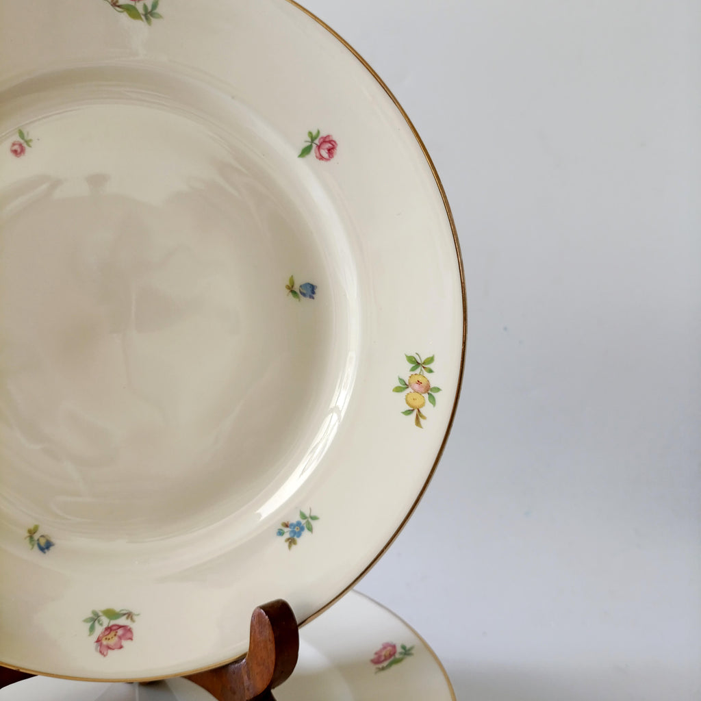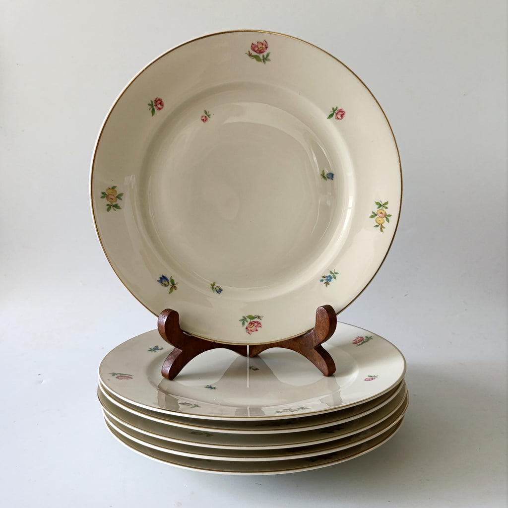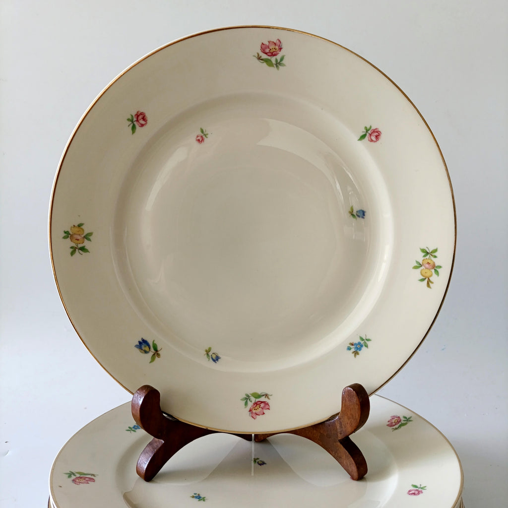 הצלחות בצבע פנינה, מעוטרות בפרחים קטנים מתוקים ושולי זהב
