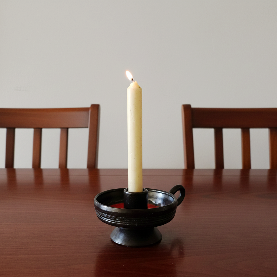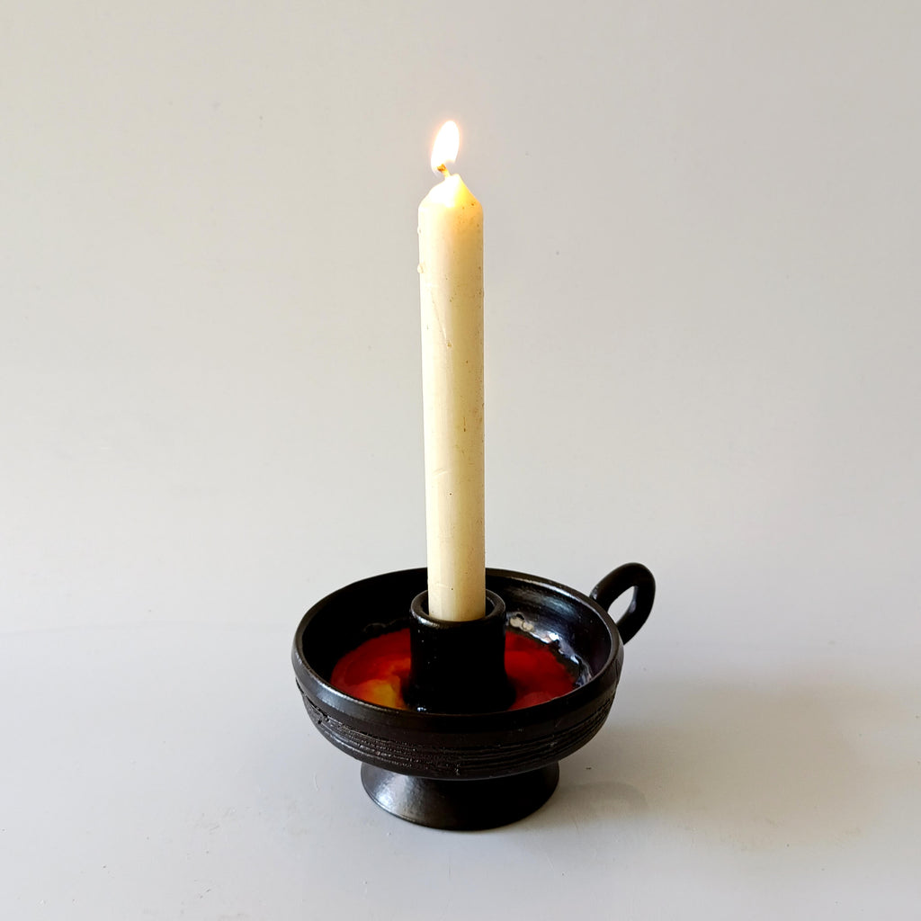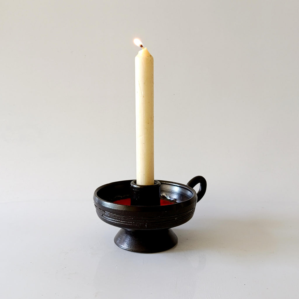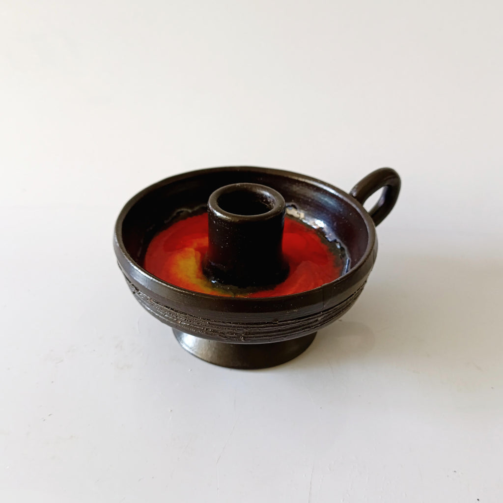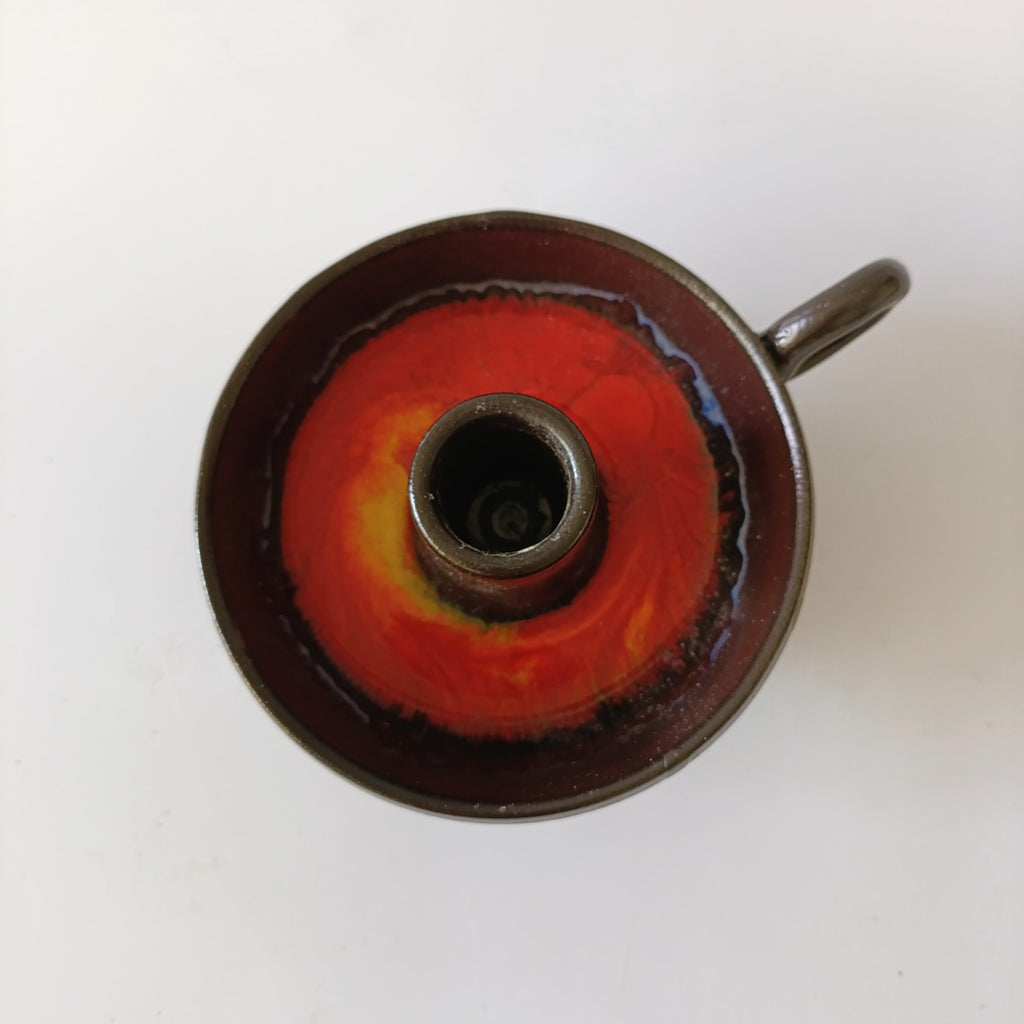 פמוט קרמיקה בצורת נר לילה - Blaker וינטג' הולנדי, שנות השבעים בצבע חום עם מרכז צבעוני בדוגמת לאבה, עומד על רגל קטנה ועם ידית מצב חדש, ללא שימוש קודם מידות: קוטר בלי ידית 11 ס"מ, גובה כ-5.5 ס"מ